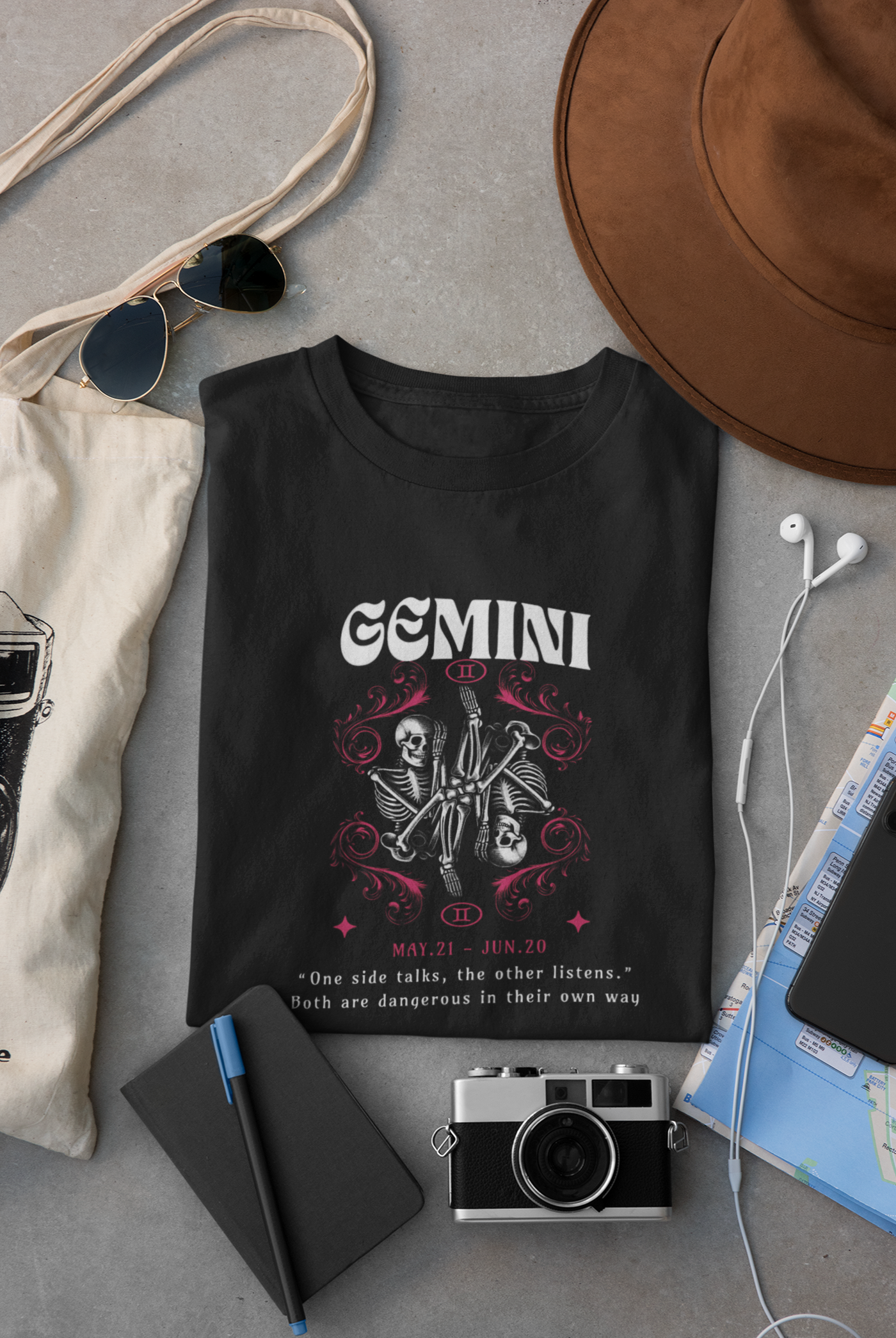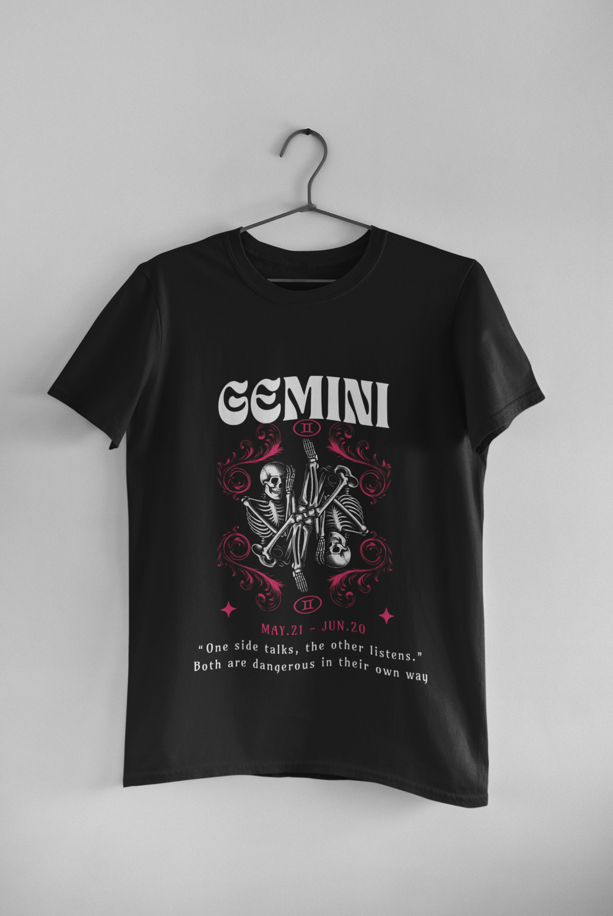 Design: Bold Gemini twin skeleton graphic with intricate red accents and empowering zodiac quote.