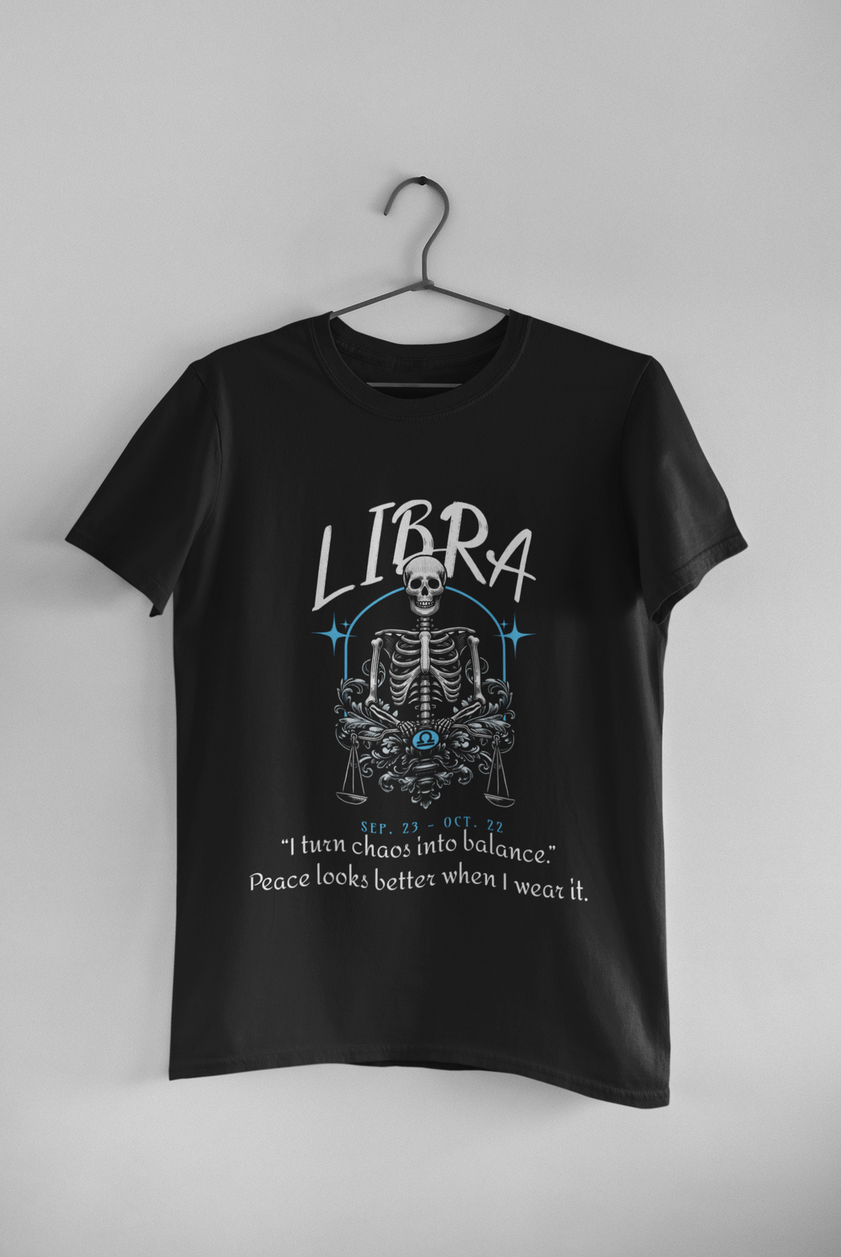 Libra Zodiac T-Shirt – Balance Seeker Astrology Tee with Skeleton Graphic