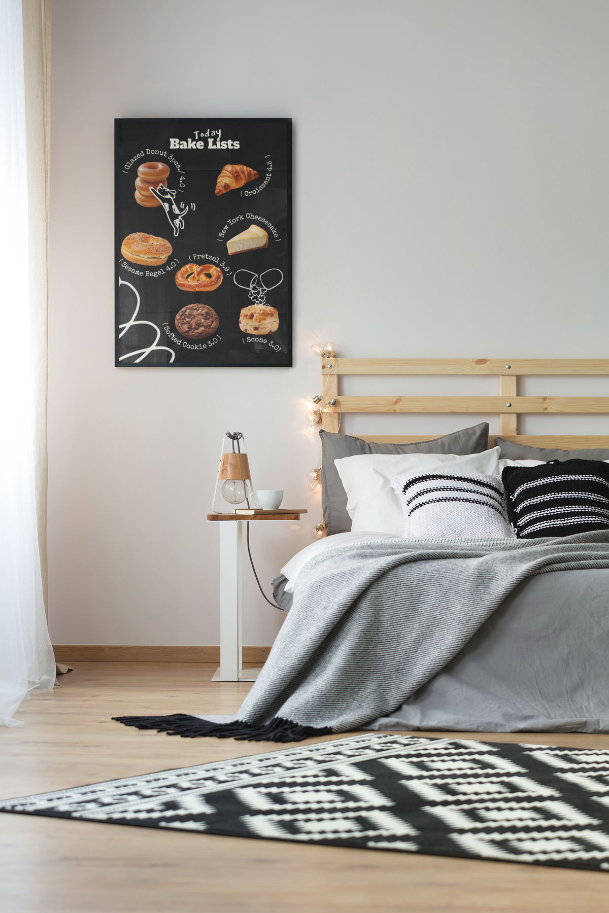 Add a delicious visual touch to your space with this Bakery Menu Style Wall Art Poster, featuring popular baked treats like donuts, croissants, bagels, pretzels, cookies, cheesecake, and scones. Designed in a playful chalkboard-style layout, this artwork brings the cozy charm of a bakery right into your interior.