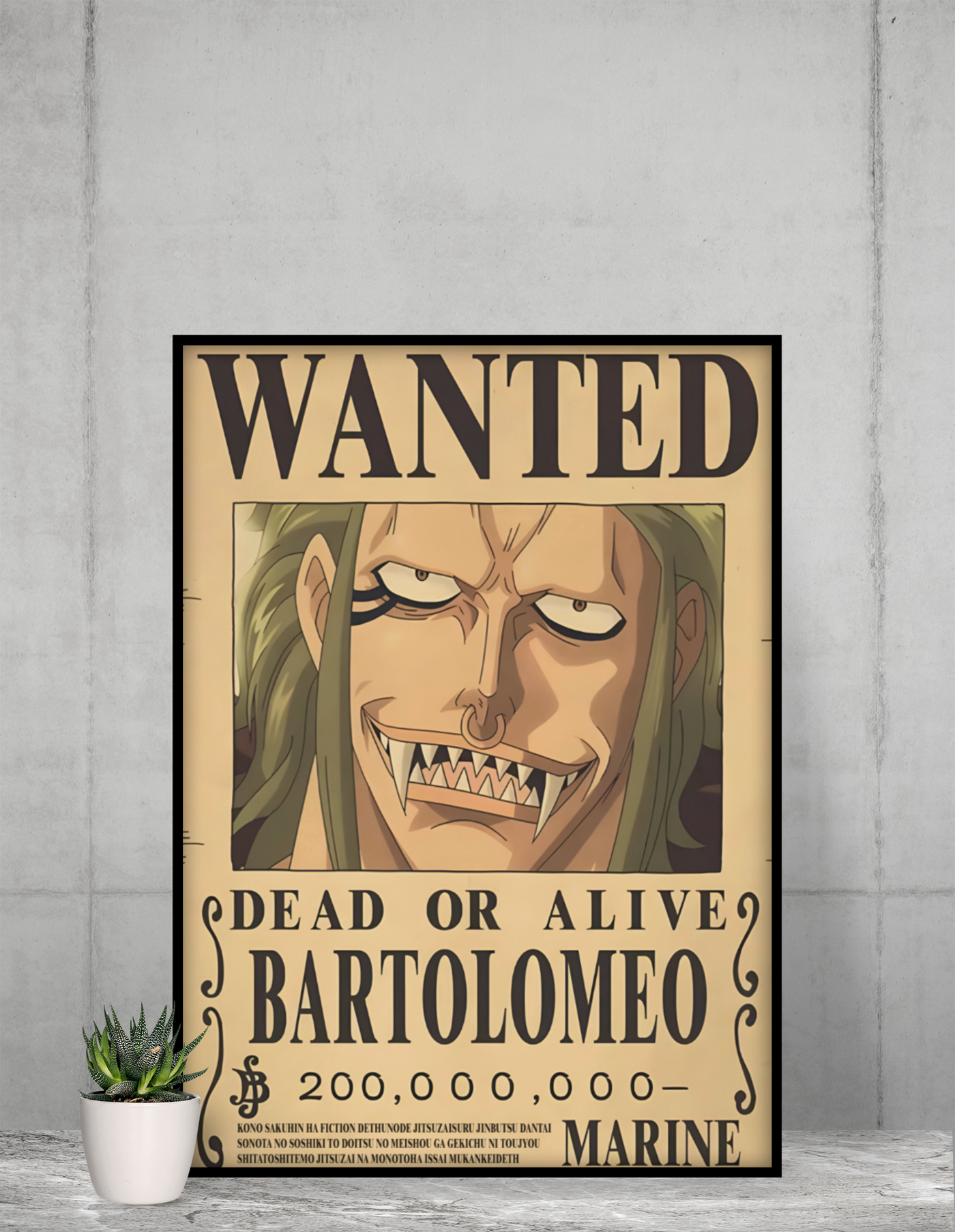Designed in the classic “Wanted – Dead or Alive” bounty poster style, this artwork captures Bartolomeo’s wild grin and rebellious personality, making it a standout piece for anime fans and collectors.