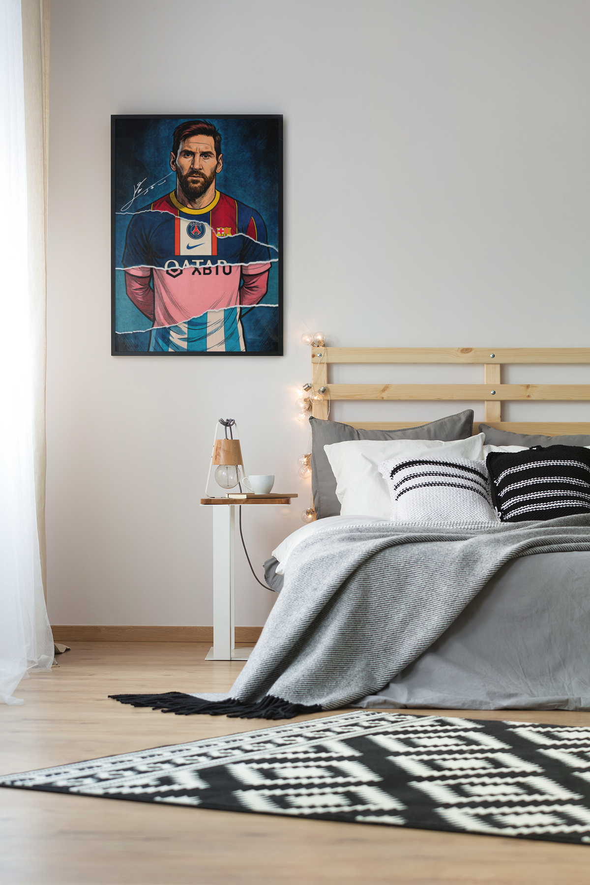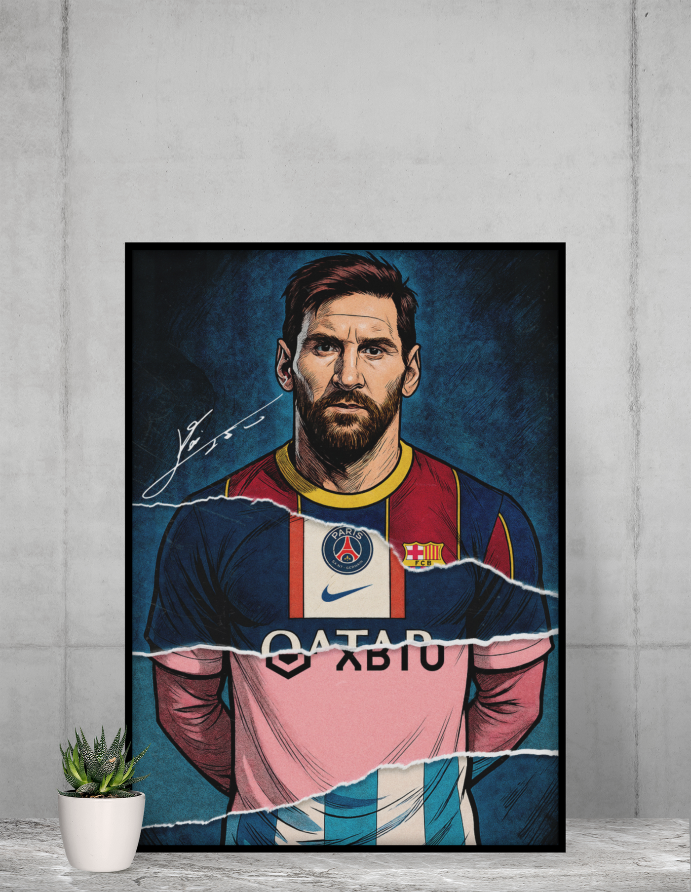 This striking artwork captures Lionel Messi in a bold, modern illustration style, blending club colors and dynamic textures to create a powerful visual statement. It’s perfect for football fans, sports-themed rooms, gaming setups, or office décor.