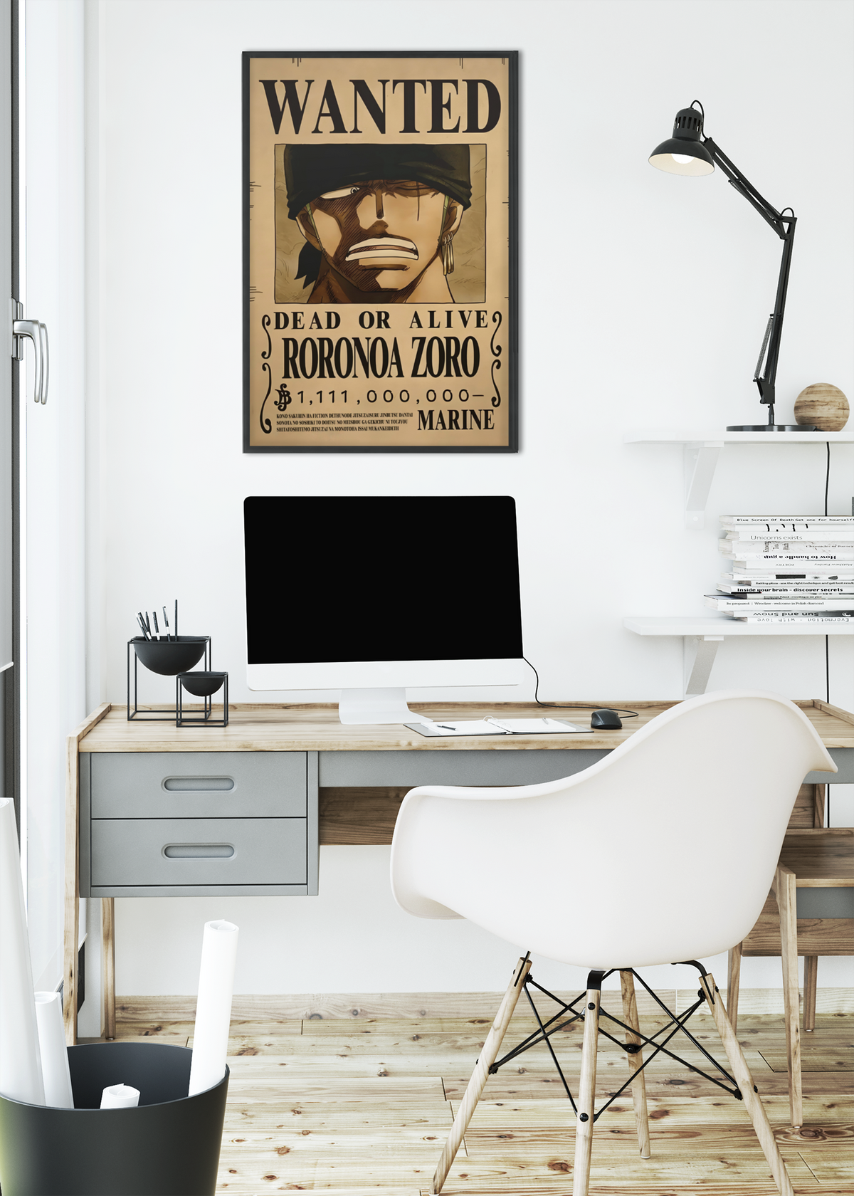 Designed in the classic “Wanted – Dead or Alive” bounty poster style, this artwork captures Zoro’s fierce expression and bold presence, making it a striking centerpiece for any anime collection, gaming setup, bedroom, or office space.