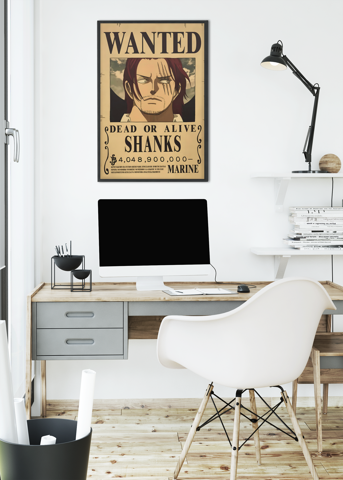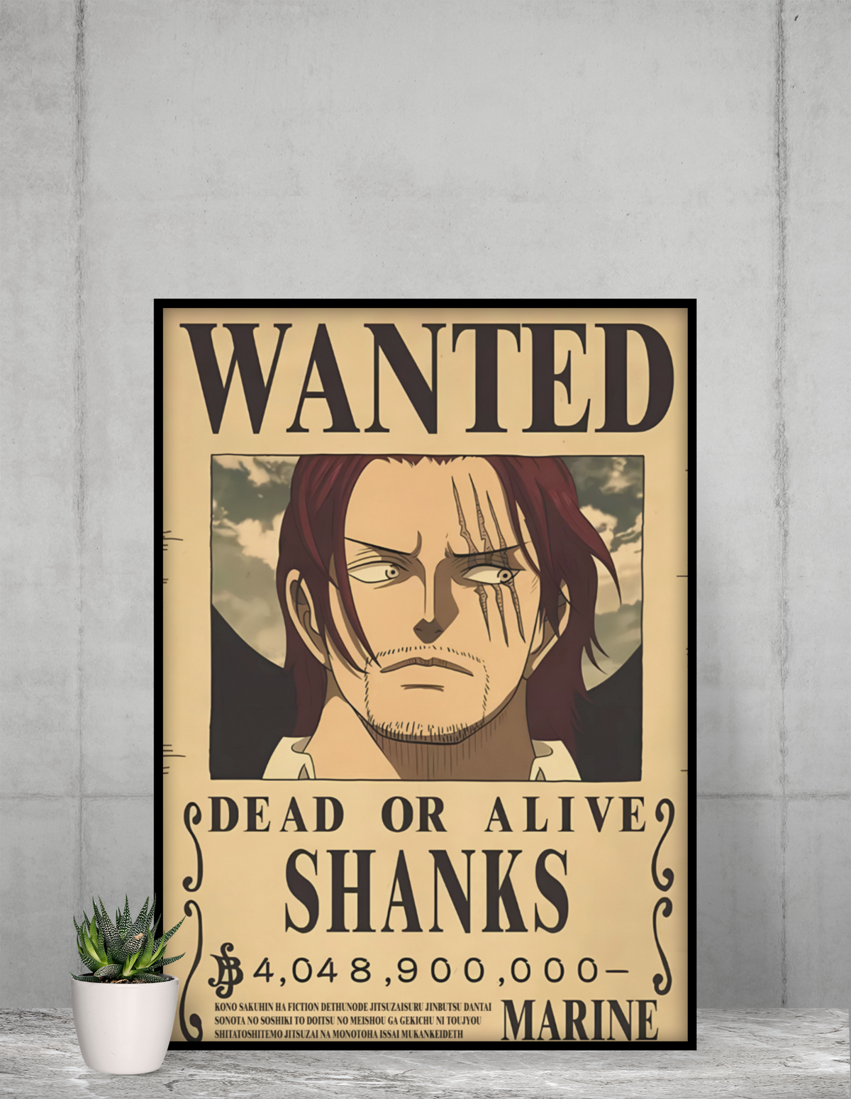 Designed in the iconic “Wanted – Dead or Alive” bounty poster style, this artwork captures Shanks’s calm yet powerful expression, making it a striking centerpiece for anime fans and collectors.
