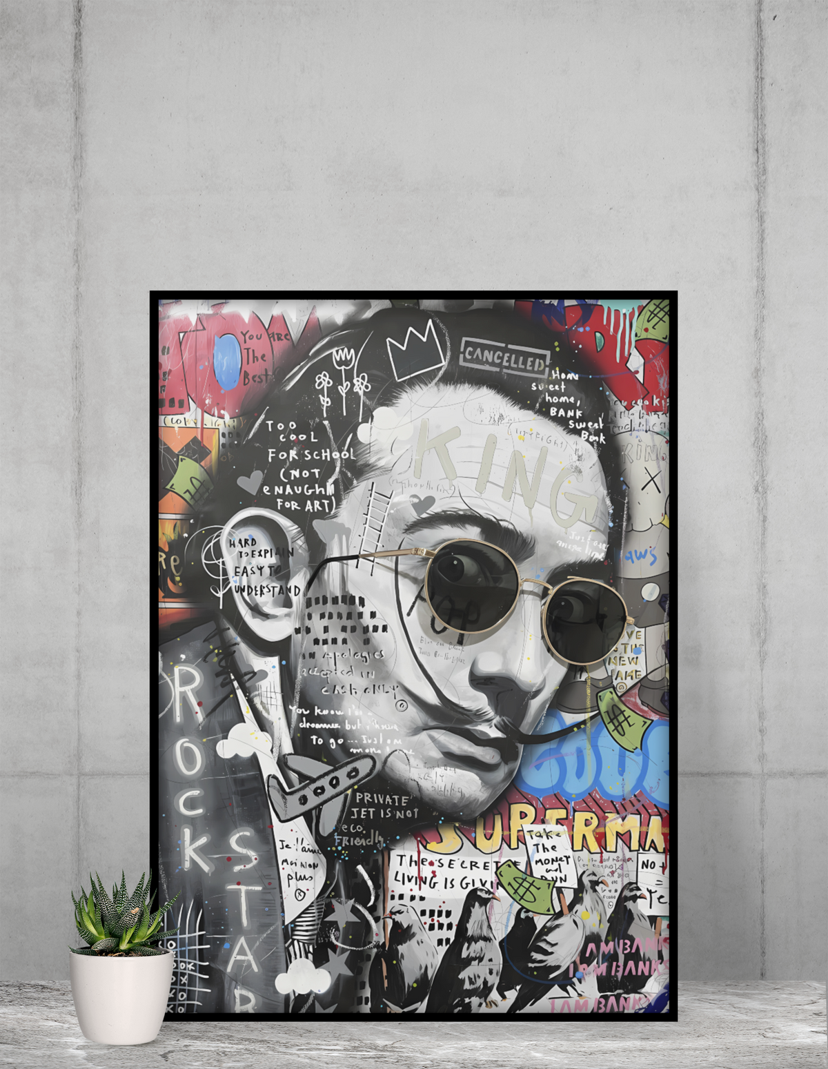Elevate your interior with this bold surreal portrait pop art acrylic wall art, blending artistic expression, street graffiti elements, and modern luxury symbolism. Featuring layered typography, graphic illustrations, and a contemporary portrait style, this piece creates a striking focal point for any modern space.